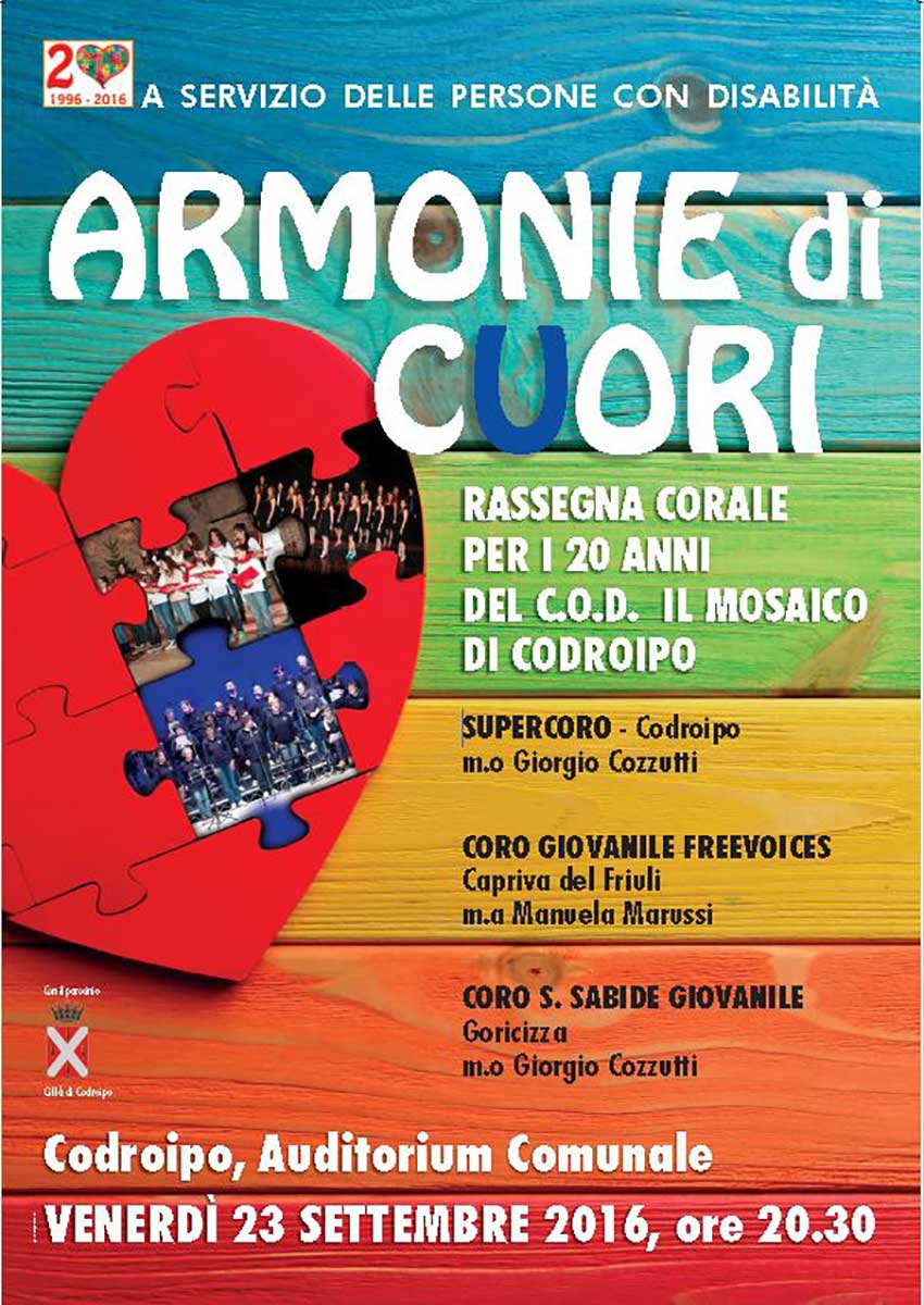 In occasione dei 20 anni del Centro occupazionale diurno per persone con disabilità, la Cooperativa Il Mosaico Onlus propone una rassegna corale con la partecipazione dei cori: