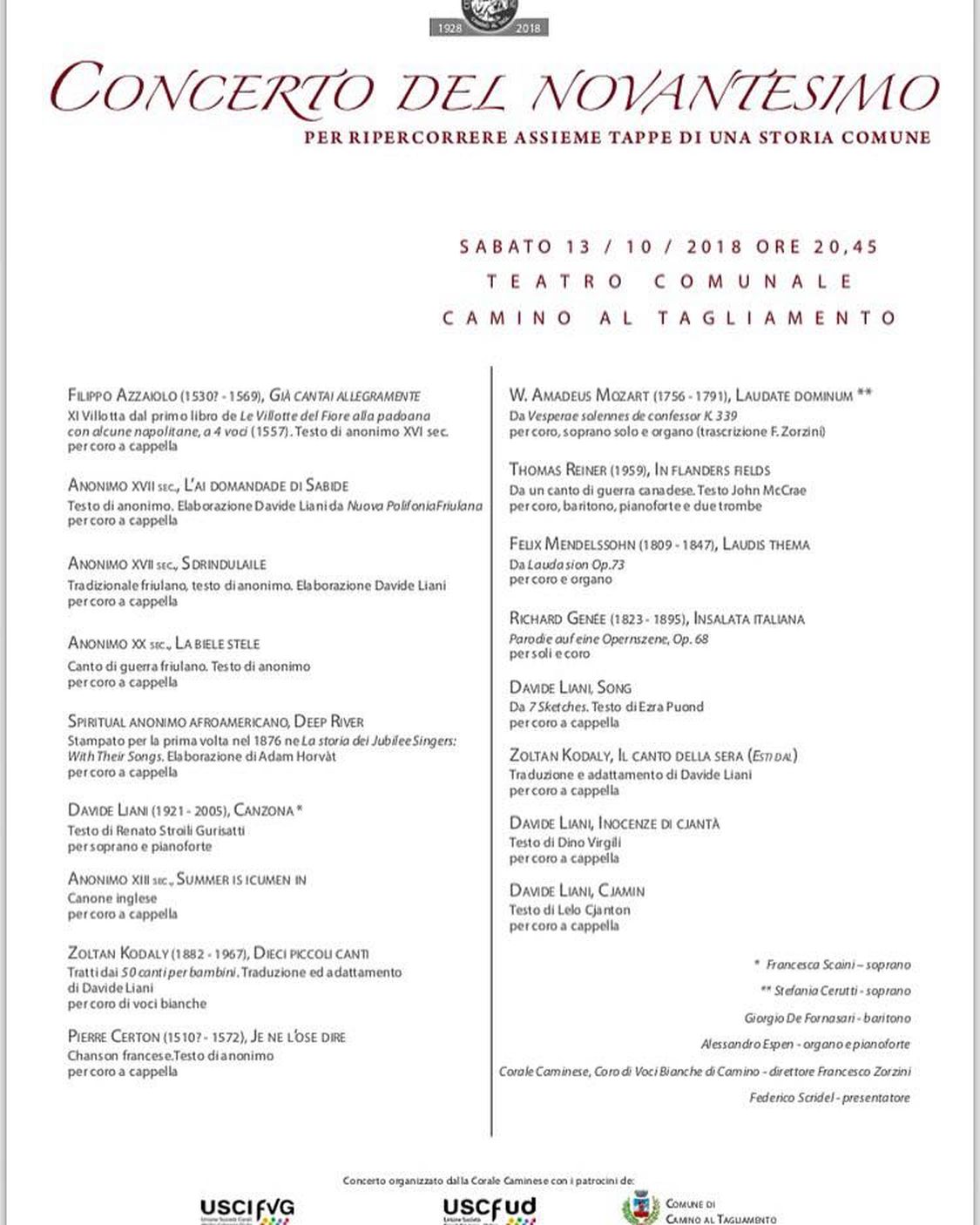 Il libretto ed il CD musicale saranno presentati in un Concerto di Gala, sabato 13 ottobre 2018 alle ore 20.45 presso il Teatro Comunale di Camino al Tagliamento. In quell’occasione oltre all’intervento della Corale Caminese, è prevista la partecipazione di alcune fra le numerose personalità del mondo artistico-musicale con cui il coro ha negli anni collaborato tra cui i soprano Francesca Scaini e Stefania Cerruti, il baritono Giorgio De Fornasari, l’attore Federico Scridel ed Alessandro Espen all’organo e pianoforte, nonché l’intervento di alcuni fra gli ex coristi.
