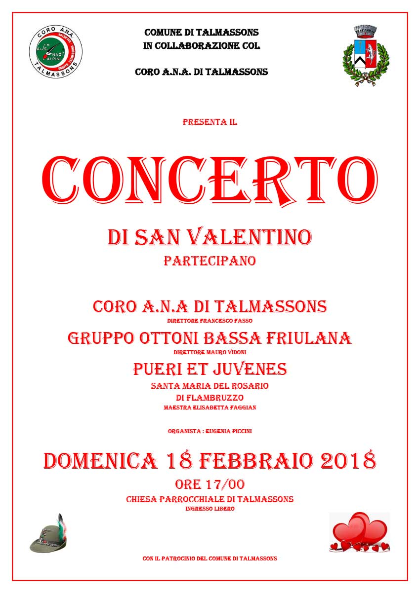 Il Coro ANA di Talmassons, con il patrocinio dell'Amministrazione comunale e la collaborazione della Parrocchia, presenta il Concerto di San Valentino Domenica 18 febbraio 2018 alle ore 17:00 nella Chiesa parrocchiale di Talmassons.