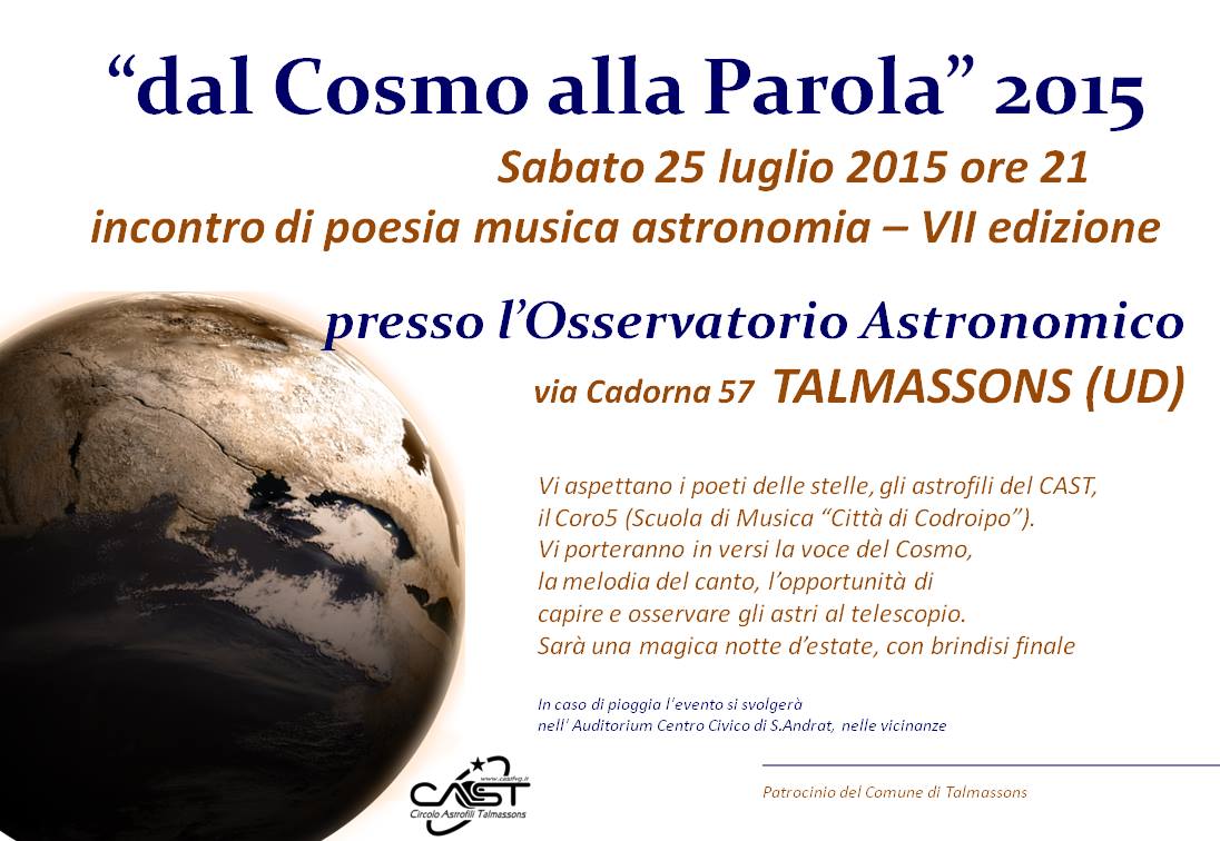 La sera del 25 luglio, alle ore 21.00, all’Osservatorio Astronomico in Via Cadorna a Talmassons, troverà vita “Dal Cosmo alla Parola”, l’importante evento interregionale di poesia, musica e osservazione delle stelle giunto alla 7° edizione. La Prof.ssa Viviana Mattiussi ha accolto il testimone passatole dall’ideatrice, la poetessa codroipese Marta Roldan, affinché continui l'ormai tradizionale incontro di arte e scienza, nella magia di una notte d'estate, nel cuore del Friuli..