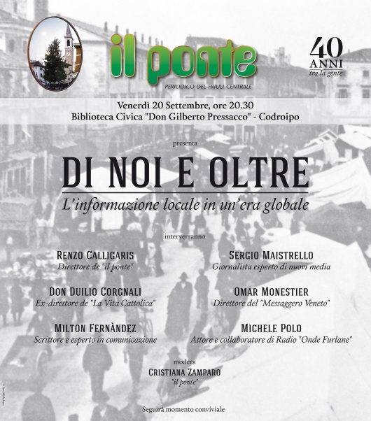 Nell’area conferenze della Biblioteca Civica “Don Gilberto Pressacco” di Codroipo, Cristiana Zamparo de “il ponte” modererà la serata a cui interverranno: -Renzo Calligaris, direttore de “il ponte” -Don Duilio Corgnali, ex-direttore de “La Vita Cattolica” -Milton Fernàndez, scrittore e esperto in comunicazione -Sergio Maistrello, giornalista esperto di nuovi media -Omar Monestier, direttore del “Messaggero Veneto” -Michele Polo, attore e collaboratore di Radio “Onde Furlane”