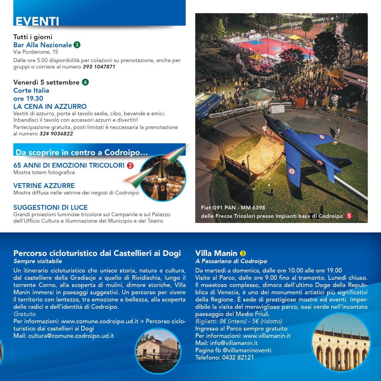 Dal 𝟰 𝗮𝗹 𝟳 𝘀𝗲𝘁𝘁𝗲𝗺𝗯𝗿𝗲 non perdetevi le “Notti Azzurre a Codroipo”: talk, concerti, mostre, proiezioni luminose, spettacoli e iniziative culturali lungo le vie del centro per accompagnare le esibizioni aeree alla base di Rivolto!