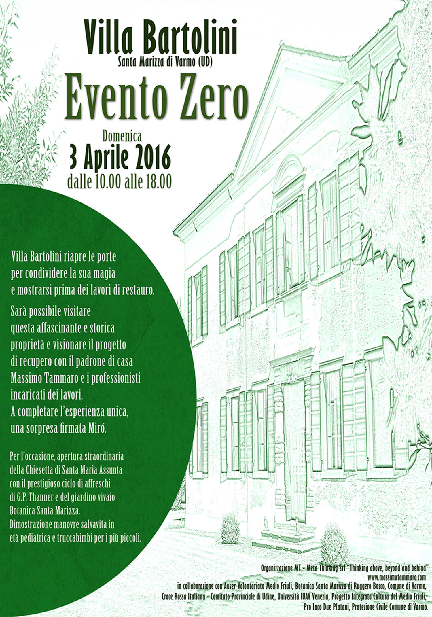 L'ex comandante delle Frecce Tricolori e oggi ideatore e fondatore di MT-Meta Thinking, società nata anche per una gestione innovativa di Villa Bartolini, con lo slogan coniato “thinking above, beyond, behind" ben evidenzia gli scopi della manifestazione EVENTO ZERO – VILLA BARTOLINI che avrà luogo domenica 3 Aprile 2016, dalle ore 10.00 alle ore 18.00, a Santa Marizza di Varmo: un’occasione unica per visitare l’affascinante e storica proprietà e il suo parco con la guida dei professionisti incaricati dei lavori che la riporteranno ai suoi antichi splendori.