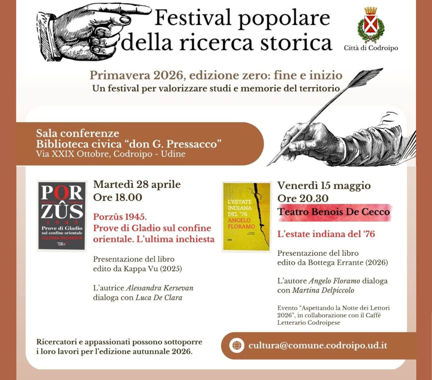 Un viaggio tra studi e memorie del territorio: 14/4 – La caduta della Serenissima con Angelo Baldan. 21/4 – Quel che resta di un giorno con Alessandro Cattunar. 28/4 – Porzûs 1945 con Alessandra Kersevan. 15/5 – L'estate indiana del ’76 con Angelo Floramo.