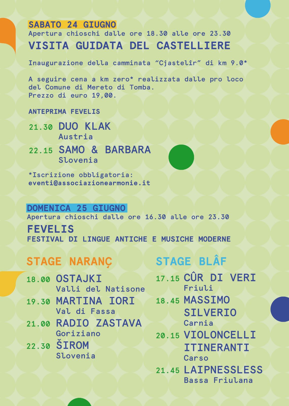 Fevelis, festival di lingue antiche e musiche moderne, è promosso dall’Associazione Armonie, con il sostegno di Regione Autonoma Friuli Venezia Giulia, Associazione Inniò, comune di Mereto di Tomba, comune di Sedegliano, ARLeF e numerosi altri soggetti pubblici e privati.