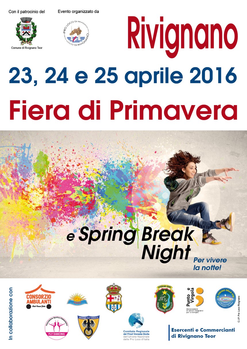 Quest’anno, in collaborazione con la Pro Loco di Rivignano, il Consorzio Ambulanti Fvg e diverse Associazioni locali, si rafforza la ormai consueta “Fiera di Primavera” dell'ultima domenica di aprile, che da questa edizione sarà articolata in ben tre giorni, il 23, 24 e 25 aprile, e sarà caratterizzata da molti eventi ed intrattenimenti per grandi e per piccini, come da programma allegato.