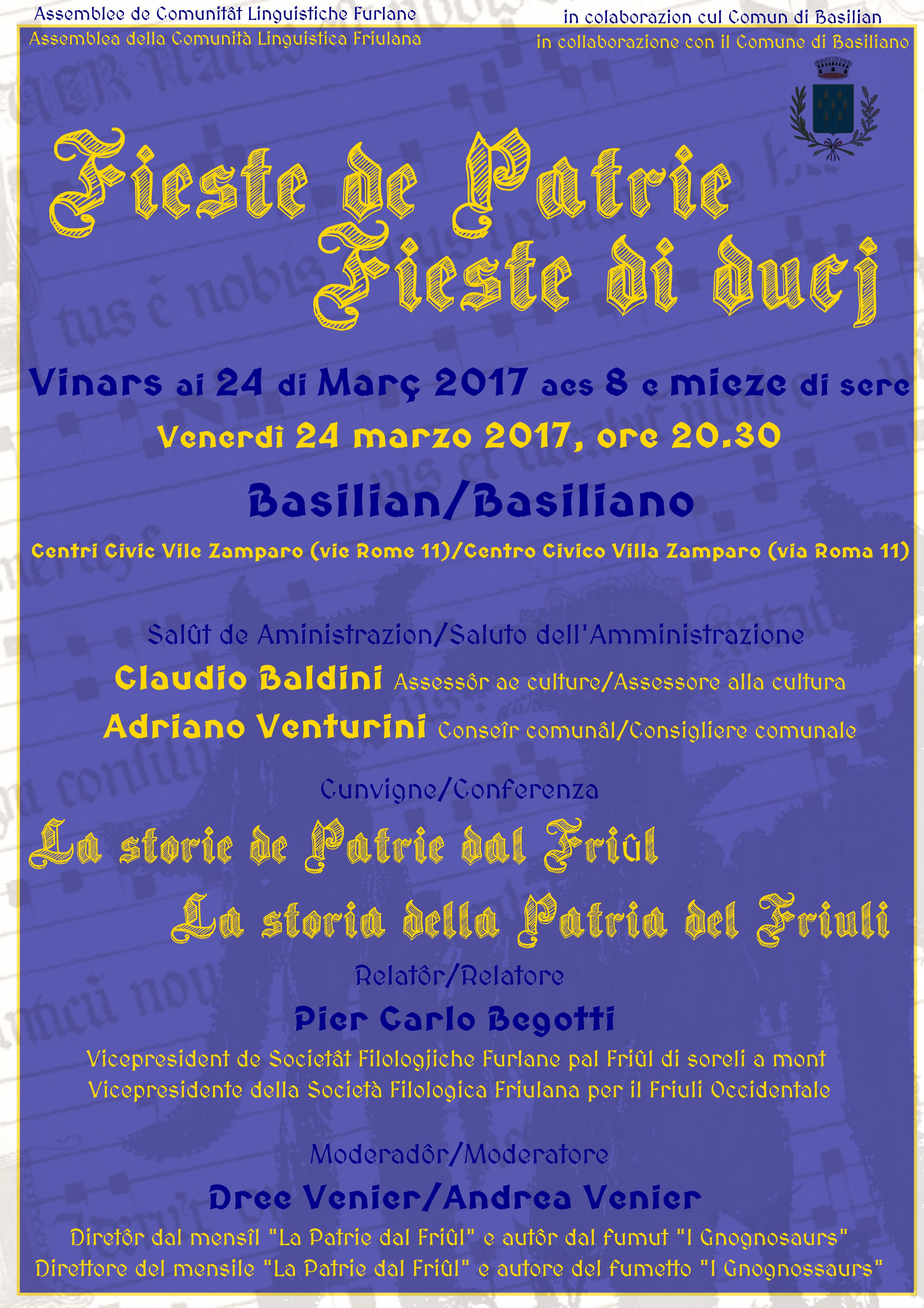 La serata, a ingresso gratuito, rientra nella serie di conferenze “Festa della Patria, festa di tutti”, organizzata dalla Comunità linguistica Friulana in oltre 30 Comuni del Friuli.