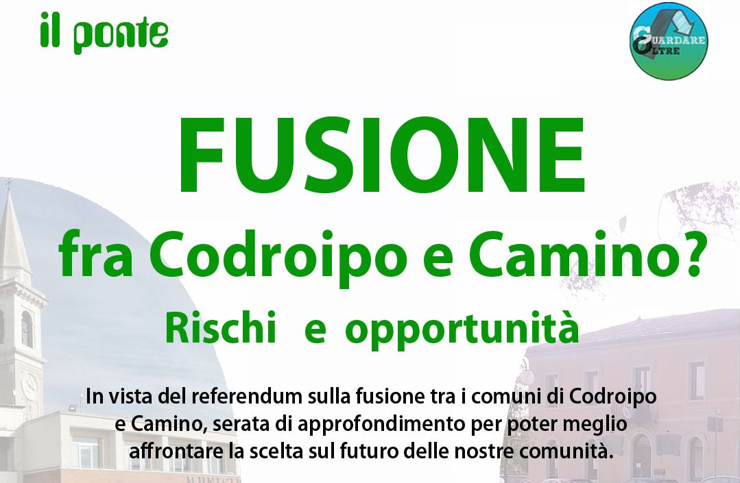 In vista del referendum sulla fusione tra i comuni di Codroipo e Camino, serata di approfondimento per poter meglio affrontare la scelta sul futuro delle nostre comunità.