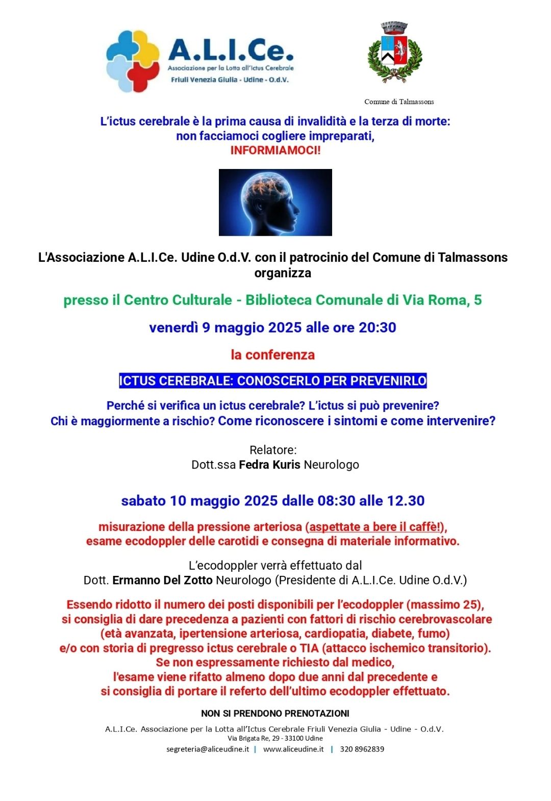 Conferenza con la neurologa dott.ssa Fedra Kuris organizzata dall'Associazione A.L.I.Ce. Udine O.d.v. in collaborazione con l'amministrazione comunale di Talmassons