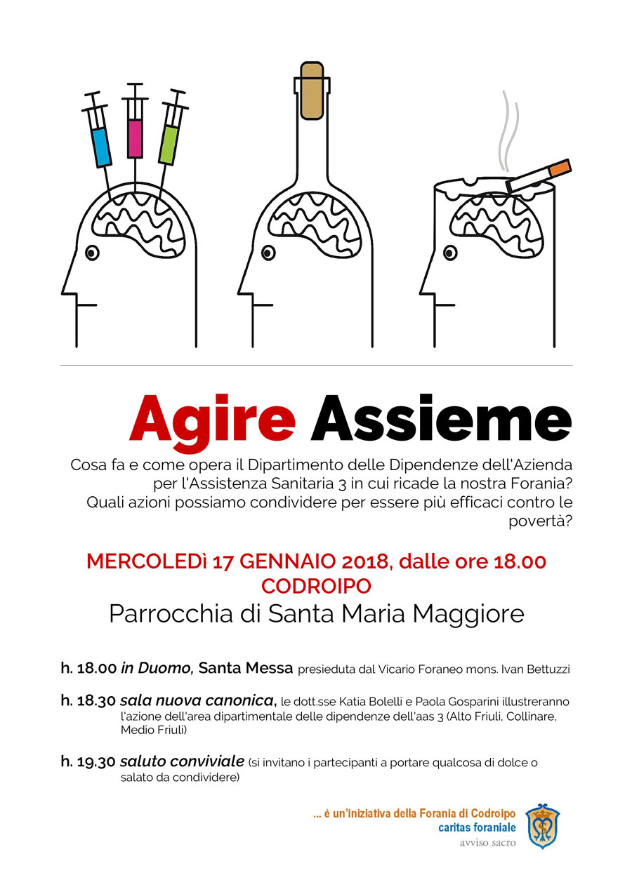Mercoledì 17 gennaio 2018 a partire dalle ore 18 ci sarà un nuovo momento di info-formazione per i volontari Caritas e tutte le persone interessate: saranno ospiti le dott.sse Bolelli e Gosparini del Dipartimento delle Dipendenze dell’Azienda per l’Assistenza Sanitaria 3 (in cui ricade la Forania di Codroipo), che parleranno di cosa fa il Dipartimento e di quali azioni si possono condividere come Caritas per essere più efficaci contro le povertà e le dipendenze che toccano anche molti degli assistiti.