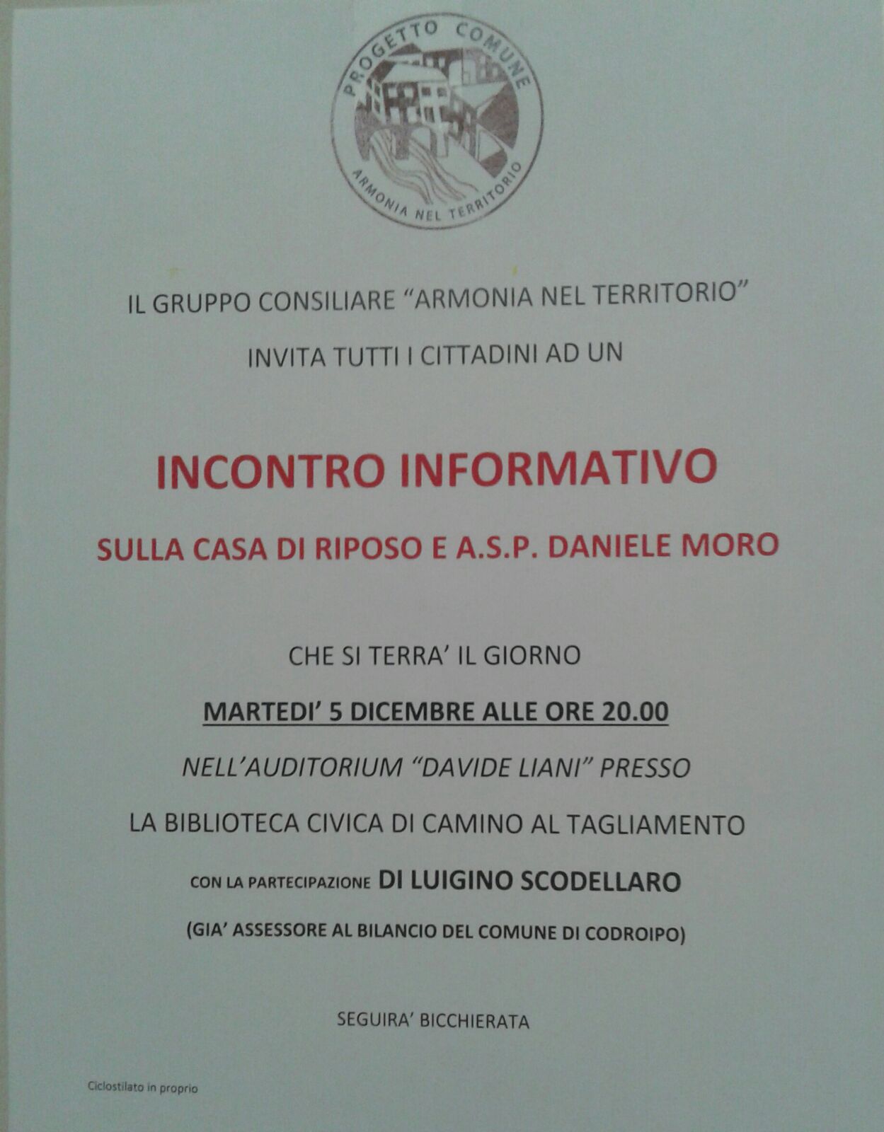 Progetto Comune - Armonia nel Territorio organizza un incontro informativo sulla casa di riposo e ASP Daniele Moro
