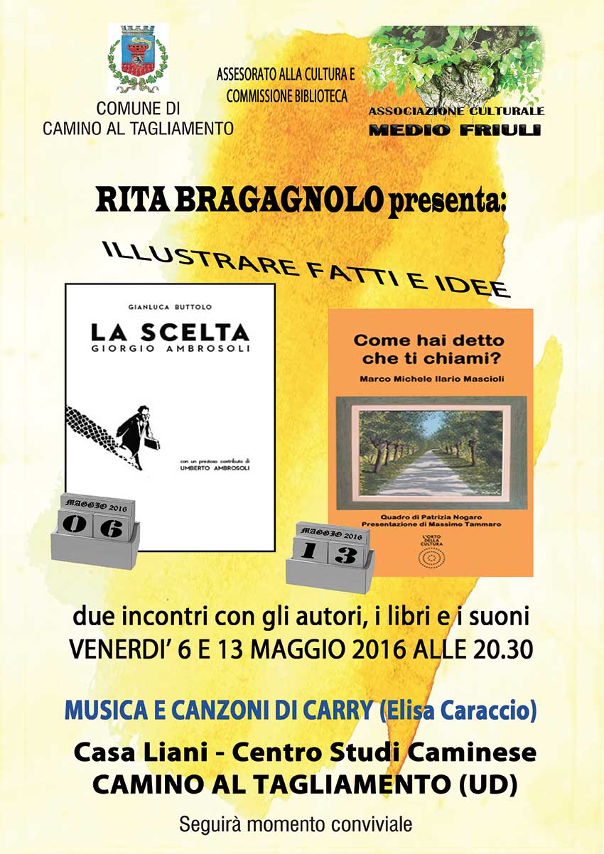 Le due serate di venerdì 6 e 13 maggio saranno occasioni proficue per condividere le esperienze, colloquiare con gli autori dei libri, ascoltare Carry interpretare alcune sue canzoni e diversi, concludendo con un brindisi.