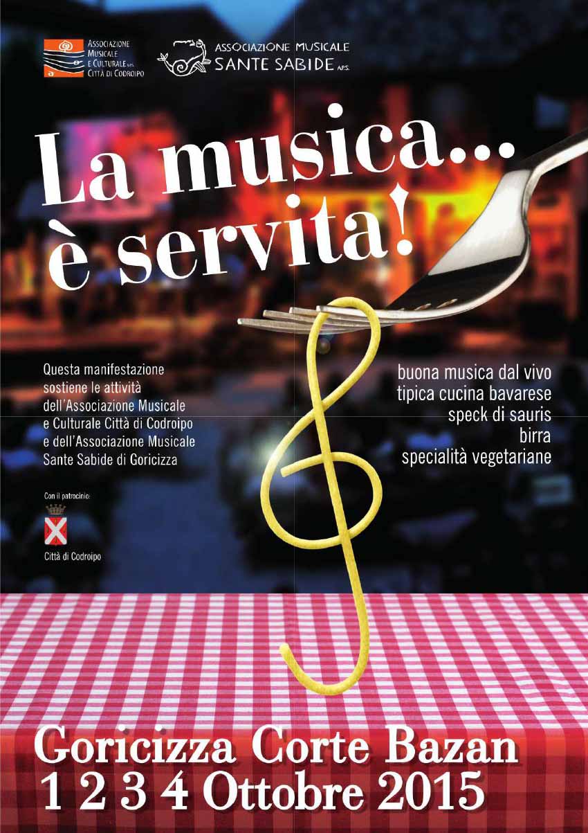 L’Associazione Musicale e Culturale “Città di Codroipo” e l’Associazione Musicale Sante Sabide organizzano nel primo week end di Ottobre la 3ª edizione di “La Musica… è servita!”, una quattro giorni nella quale è possibile farsi trasportare dalle intense emozioni della musica. Sui vari palchi allestiti per l’occasione si esibiranno i tanti gruppi musicali e corali delle due associazioni ma anche complessi di chiara fama e riconosciuta qualità.