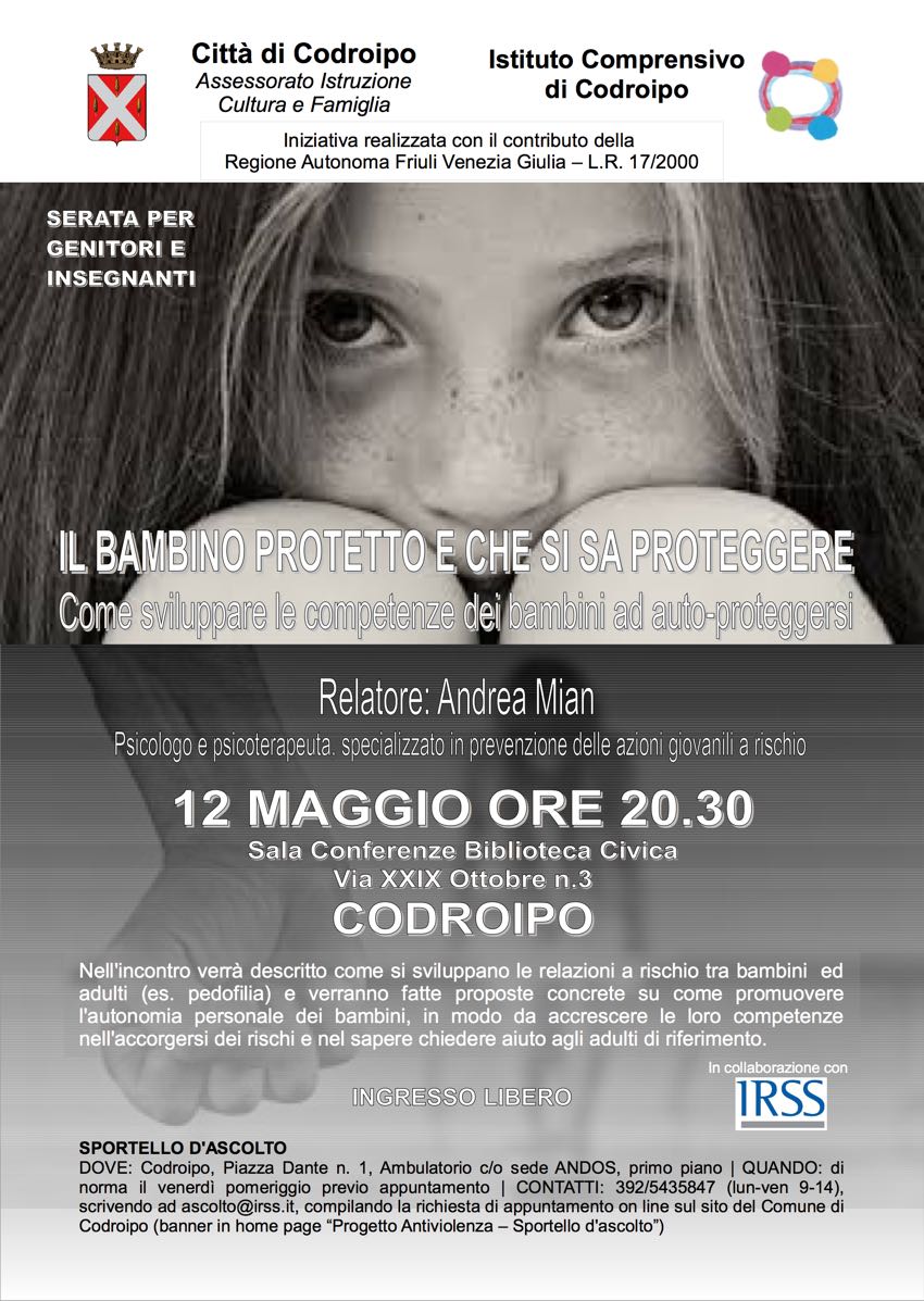Nell'incontro verrà descritto come si sviluppano le relazioni a rischio tra bambini ed adulti (es. pedofilia) e verranno fatte proposte concrete su come promuovere l'autonomia personale dei bambini, in modo da accrescere le loro competenze nell'accorgersi dei rischi e nel sapere chiedere aiuto agli adulti di riferimento.