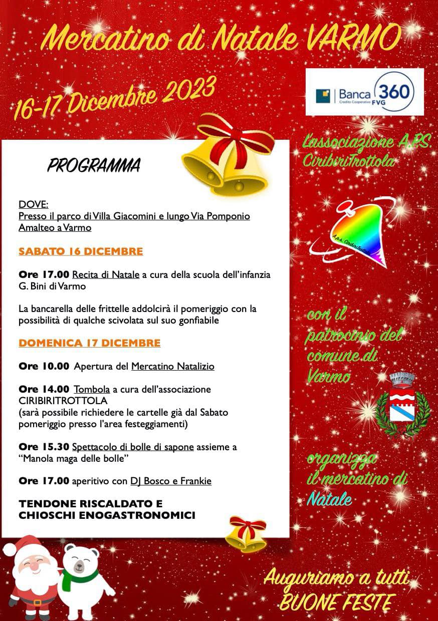 Per la terza volta consecutiva, tornano a Varmo i mercatini di Natale. Quest’anno, nella cornice di Villa Giacomini, cominciano sabato 16 dicembre i primi festeggiamenti con la recita dei bimbi della scuola materna alle ore 17:00 e chioschi enogastronomici attivi dal pomeriggio.