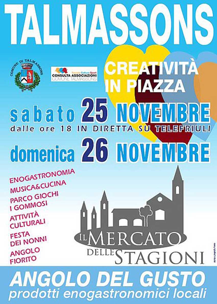 Sabato 25 novembre ore 12.30 - Festa dei nonni con la collaborazione della scuola dell'infanzia "U.Caparini" e pranzo sotto il tendone (su prenotazione) dalle ore 14.00 - Attività per bambini: Spettacolo di magia con I MAGHI PER CASO - I BAMBINI E LA MUSICA con l'Associazione Ziqqurat ore 15.30 - Presentazione del libro CONTIS CONTADIS 2 di e con DARIO ZAMPA ore 17.30 - Inaugurazione Mostra di pittura del m° Bruno Ponte presso l'atrio del municipio ore 18.00 - LA TELEVISIONE IN PIAZZA in diretta su Telefriuli, conduce Daniele Paroni dalle ore 18.00 Apertura Angolo del Gusto con l'Agriturismo Pituello e la Pizzeria Al Platano e con il chiosco di Festinpiazza