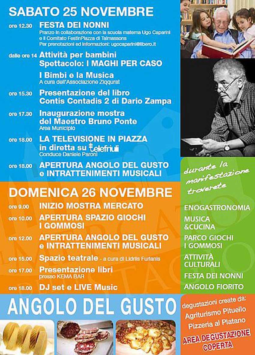 Domenica 26 novembre ore 9.00 Apertura Mostra Mercato lungo le vie del centro paese ore 10.00 Apertura Spazio giochi GOMMOSI ore 12.00 Apertura ANGOLO DEL GUSTO e INTRATTENIMENTO MUSICALE ore 15.00 Spazio teatrale a cura dell'Associazione Lidris Furlanis ore 17.00 presso KEMA BAR Presentazione libri a cura di Lidris Furlanis dalle ore 18.00 ANGOLO DEL GUSTO e DJ set & Live Music