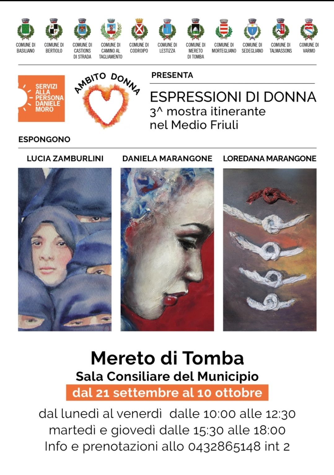 È ripresa la mostra itinerante, "Espressioni di Donna" delle artiste Loredana e Daniela Marangone e Lucia Zamburlini, iniziata a settembre 2019 a Basiliano, poi esposta poi anche a Talmassons, Lestizza, Varmo, Camino al Tagliamento e Bertiolo e congelata da marzo scorso causa Covid-19. L’esposizione è visitabile in biblioteca a Codroipo fino al 18 settembre e poi fino al 10 ottobre a Mereto di Tomba in Sala Consiliare. Dal 17 ottobre all'8 novembre sarà ospitata a Sedegliano, dal 10 al 18 novembre a Castions di Strada e dal 20 novembre al 4 dicembre a Mortegliano. La mostra è visitabile in tutti i comuni su prenotazione. Domenica 22 novembre a Mortegliano si terrà, sempre nel rispetto della normativa e delle precauzioni anti Covid-19, la marcia di sensibilizzazione itinerante per l'eliminazione della violenza di genere "Tutti per Lei" giunta alla 5^ edizione, (precedentemente svoltasi a Codroipo, Bertiolo, Castions di Strada, Camino al Tagliamento). La partenza è prevista alle ore 9:00 con iscrizione dalle ore 8:30 presso l'area festeggiamenti di Mortegliano. Si potranno effettuare 2 tipi di percorso a circuito con 2 kilometraggi differenti con il medesimo ritrovo finale sempre nell'area festeggiamenti/campo sportivo in V.le Friuli. Previsti inoltre nella settimana dedicata all'eliminazione della violenza di genere, altri eventi di tipo culturale nei comuni del Medio Friuli.