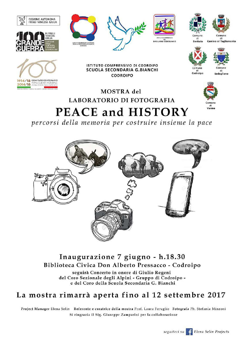 Mercoledì 7 giugno sarà inaugurata la mostra fotografica "Peace and History: percorsi della memoria per costruire insieme la pace" realizzata dagli studenti della Scuola Secondaria G. Bianchi di Codroipo nell'ambito di un progetto regionale portato avanti dal Comitato Centenario Prima Guerra Mondiale.