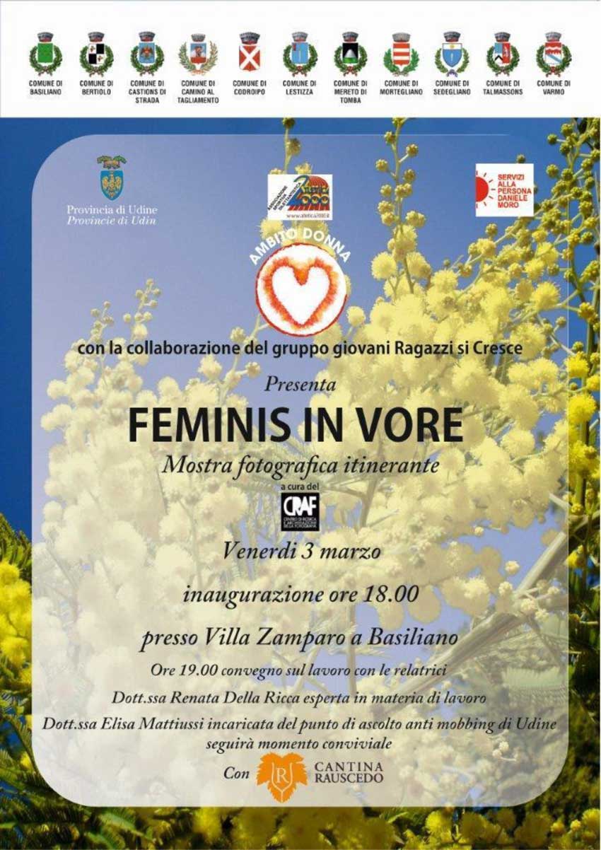 La mostra fotografica “Feminis in vore” è una mostra itinerante, per un massimo coinvolgimento delle donne e degli uomini del Medio Friuli e non solo, e toccherà pertanto, tutti i comuni aderenti ad Ambito Donna.