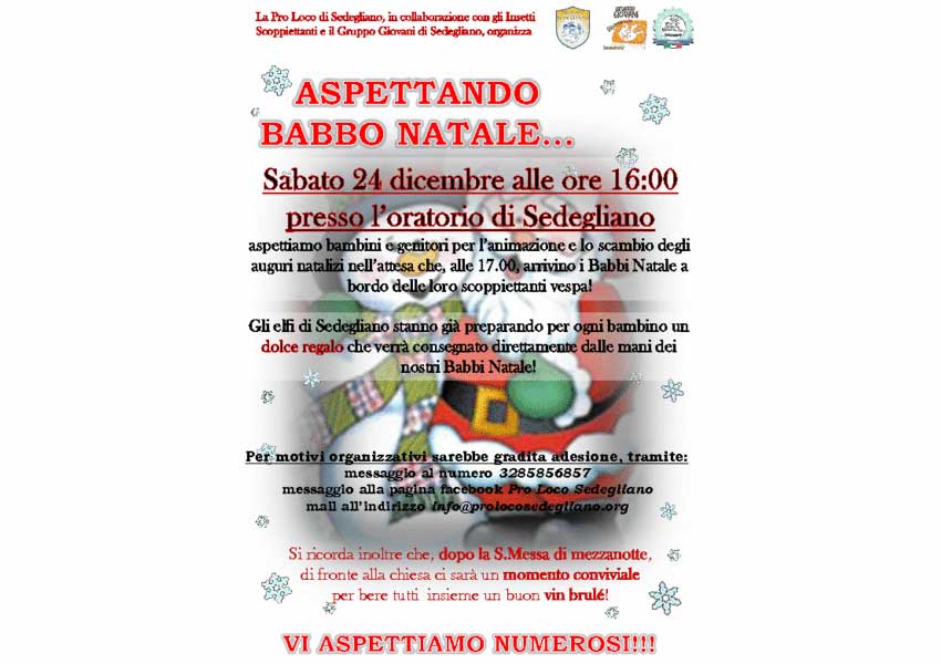 SABATO 24 DICEMBRE - ORE 16:00 presso l'ORATORIO DI SEDEGLIANO