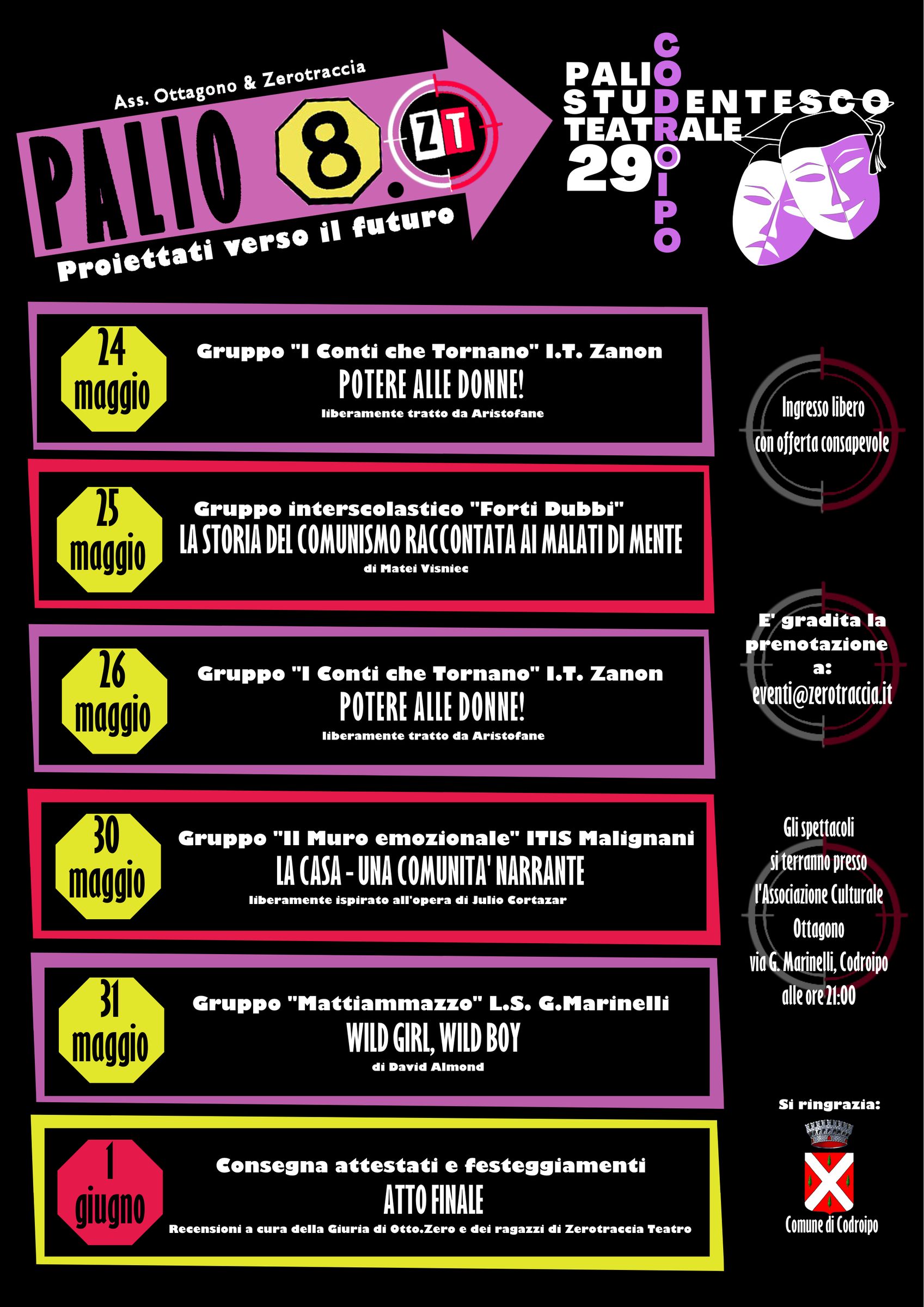 La 29a edizione prende la nuova veste di Palio Otto.Zero. Dopo due anni di pausa forzata, l’Associazione Culturale Ottagono e Zerotraccia Teatro hanno unito le forze per riportare sulla scena i gruppi teatrali delle scuole del territorio, consapevoli del valore educativo che l’esperienza teatrale rappresenta per le nuove generazioni sia quando i ragazzi sono chiamati a vivere l’emozione del palco, sia quando viene loro richiesto di assistere come pubblico consapevole.