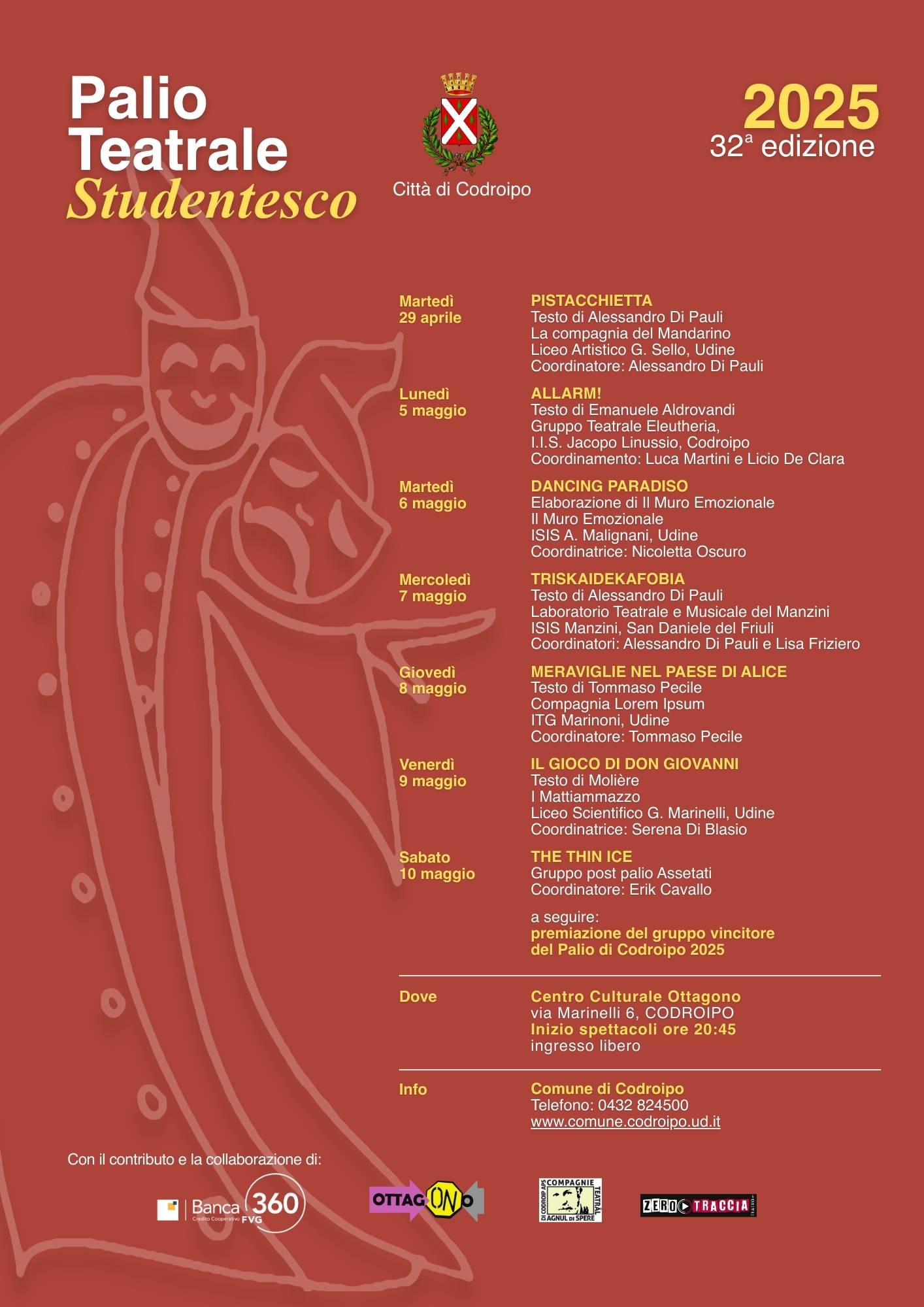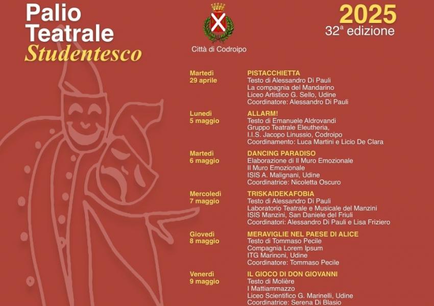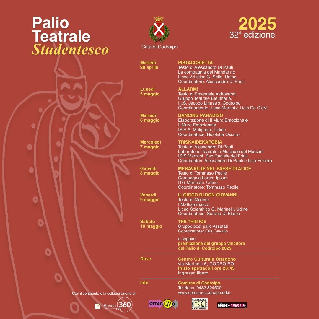 32^ edizione del Palio Teatrale Studentesco “Città di Codroipo”, organizzato dall’Amministrazione comunale di Codroipo con la partecipazione: Banca 360 FVG – Codroipo, Associazione Culturale Ottagono, Compagnia Teatrâl Agnul di Spere, Associazione Zerotraccia Teatro APS.