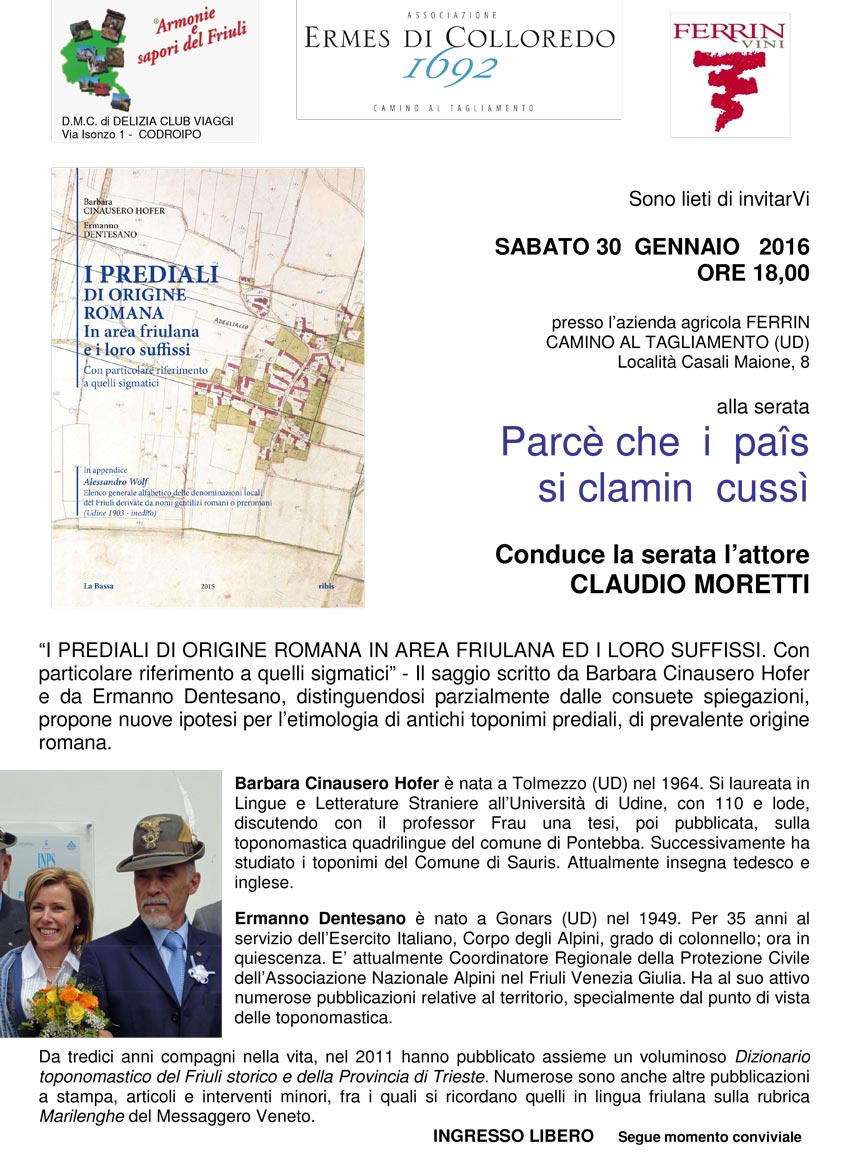 Ne parleremo con ERMANNO DENTESANO e BARBARA VINAUSERO HOFER autori del volume "I PREDIALI DI ORIGINE ROMANA IN AREA FRIULANA ED I LORO SUFFISSI"