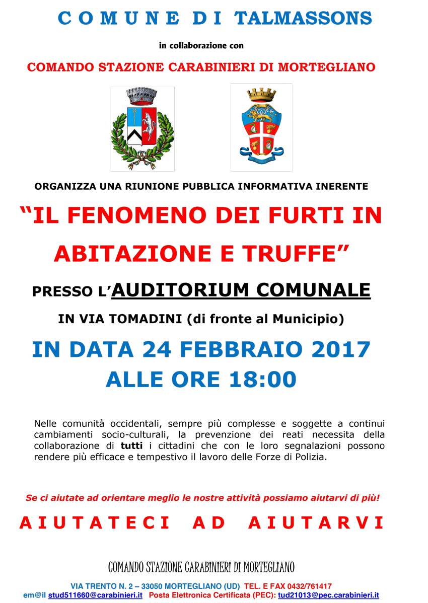 Il Comando Stazione Carabinieri di Mortegliano promuove un incontro informativo inerente "IL FENOMENO DEI FURTI IN ABITAZIONE E TRUFFE" rivolto a tutta la cittadinanza.