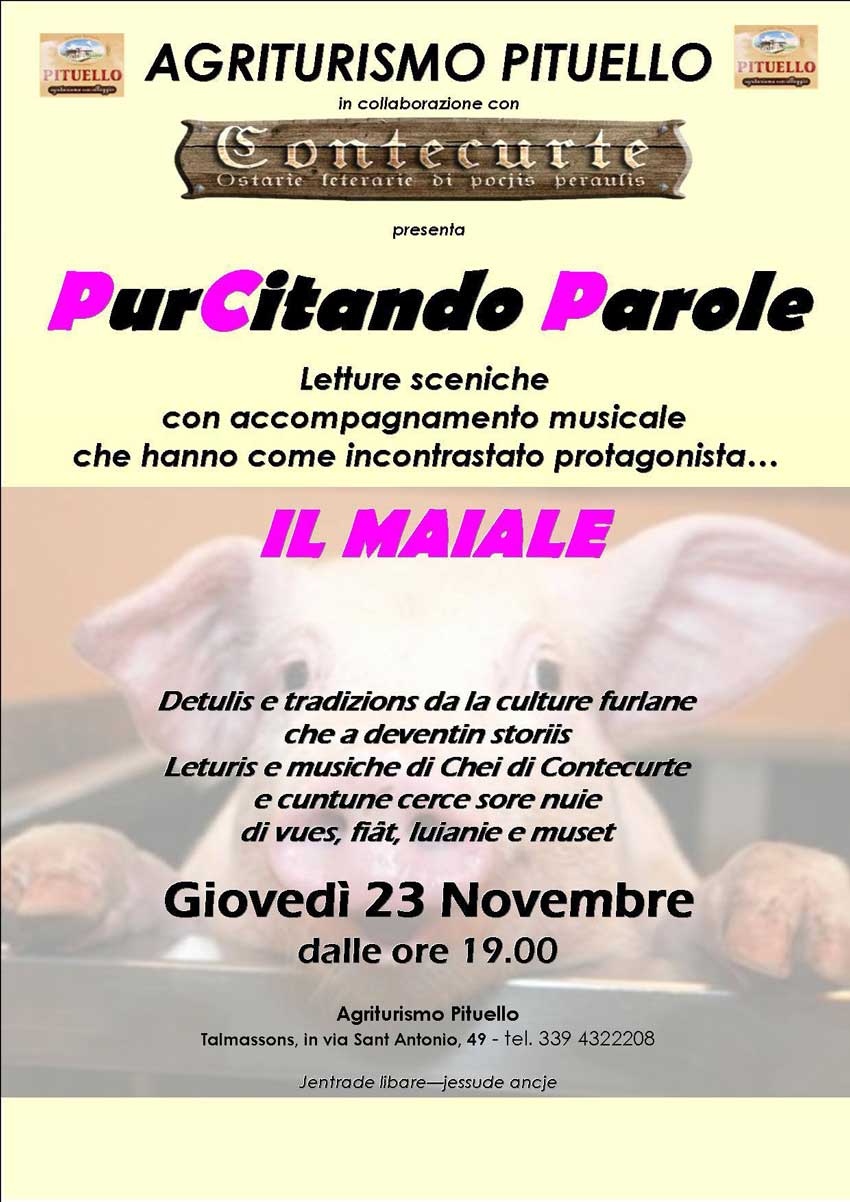 E il Purcit sarà anche il protagonista della tavola, con gli assaggi preparati e offerti dall'Agriturismo Pituello, di Talmassons, padrone di casa e padrino dell'evento. Vues di Purcit, Muset, Luianie e Fiât cu la cevole, saranno i protagonisti della serata.