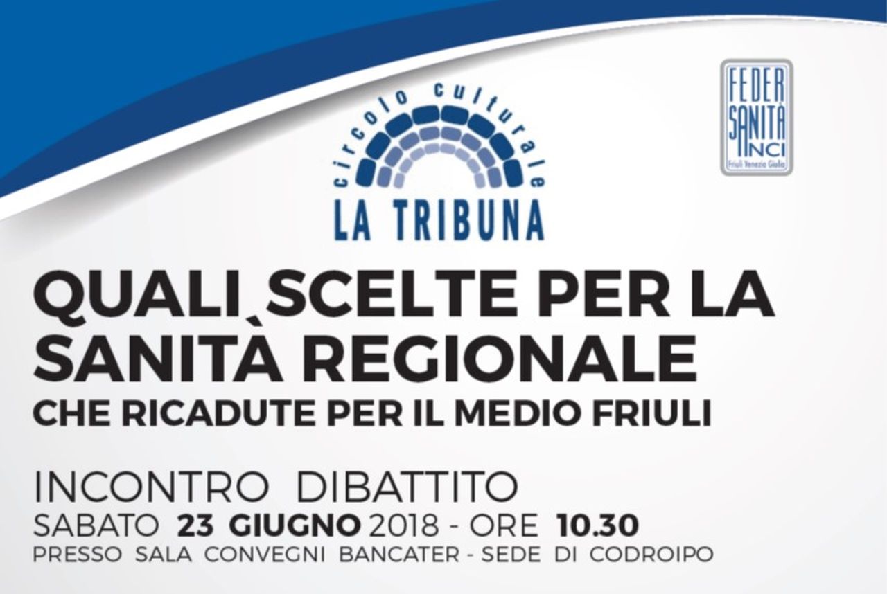 Il circolo culturale La Tribuna di Codroipo, continua l’attività di informazione su temi di rilevanza sociale o politica, comunque di stretta attualità, con un incontro pubblico su: “ Quali scelte per la sanità regionale, che ricadute per il Medio Friuli”. A dibatterlo ci sarà il neo vice presidente ed assessore alla salute, politiche sociali, disabilità della Regione Friuli Venezia Giulia, dott. Riccardo Riccardi, il presidente Federsanità Anci FVG dott. Giuseppe Napoli, la dott.ssa Laura Regattin Direttore Sanitario dell’A.A.S. n.3 Alto Friuli - Collinare – Medio Friuli. La riunione aperta a tutti, con particolare riguardo agli operatori di un settore così importante come quello della sanità che in numero notevole hanno già preannunciato l’adesione, sarà moderata dal dott. Luigi Canciani. Lo svolgimento prevede l’inizio dalle ore 10.30 di sabato 23 giugno prossimo, nella Sala Convegni della BancaTer sede di Codroipo, entrata lato giardini. Quest’iniziativa del Circolo La Tribuna, registra il patrocinio di Federsanità Anci F.V.G., dell’assicurazione Allianz agenzia di Codroipo, di BancaTer credito cooperativo FVG e del periodico del Medio Friuli “Il Paese”. Chiunque dei presenti potrà intervenire nella discussione che si preannuncia interessante e serrata. Lecito attendersi dunque una folta e nutrita partecipazione.