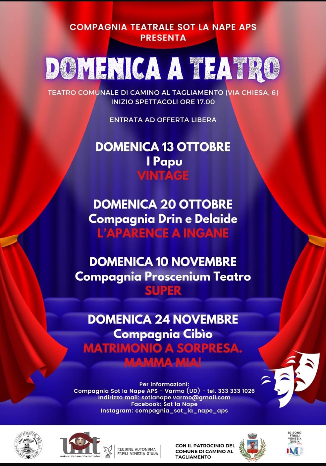 La Rassegna Teatrale organizzata dal Comune di Camino al Tagliamento in convenzione con la Compagnia Filodrammatica Sot la Nape si presenta in una nuova veste: quattro spettacoli tra ottobre e novembre, tutti di domenica, con orario di inizio alle 17. Un bel modo per trascorrere del tempo di qualità con la comodità di non doversi spostare in ore serali.