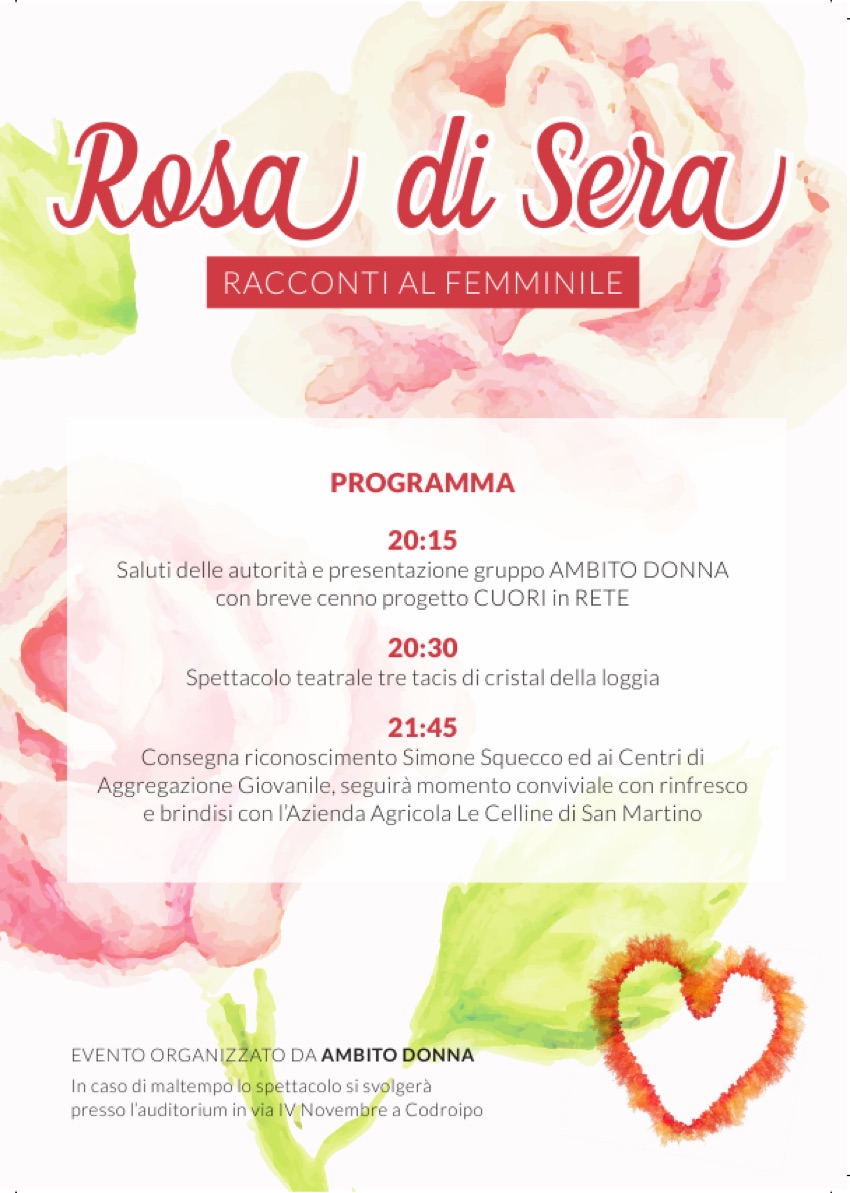 Durante la serata si terrà la presentazione ufficiale del gruppo Ambito Donna, nato con l'obiettivo di informare e sensibilizzare sulle tematiche della discriminazione e della violenza di genere.