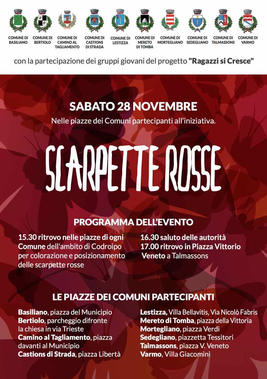 Il 25 novembre, giornata internazionale contro la violenza sulle donne, proponiamo di ricordare tutte le vittime con l’evento “SCARPETTE ROSSE” dove ogni paio di scarpe rappresenta una donna e la traccia della violenza subita... in rosso, come il sangue versato ma anche come il cuore, l'amore e la volontà di opporsi ai maltrattamenti.