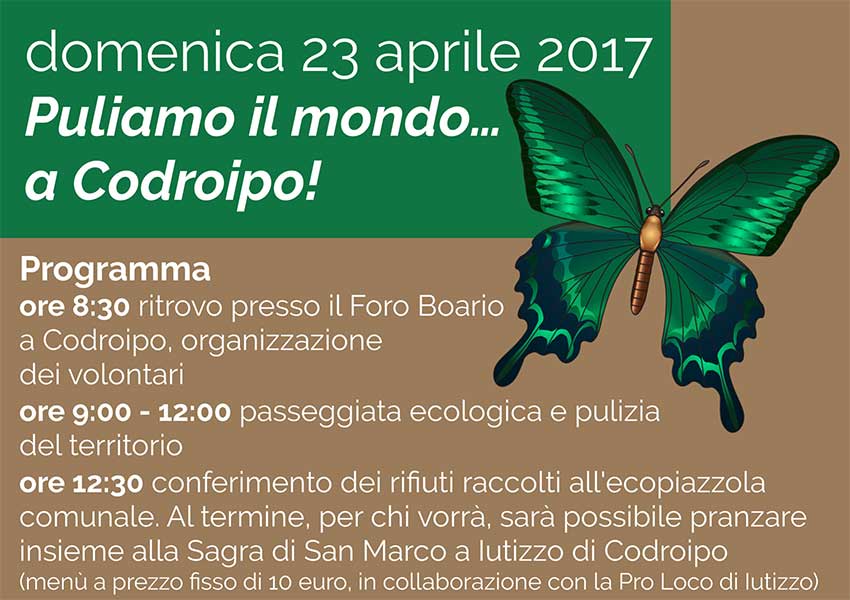 Domenica 23 alle ore 8:30 presso il Foro Boario – “Puliamo il mondo... a Codroipo!” Con la partecipazione e il. sostegno delle associazioni e dei cittadini di Codroipo.