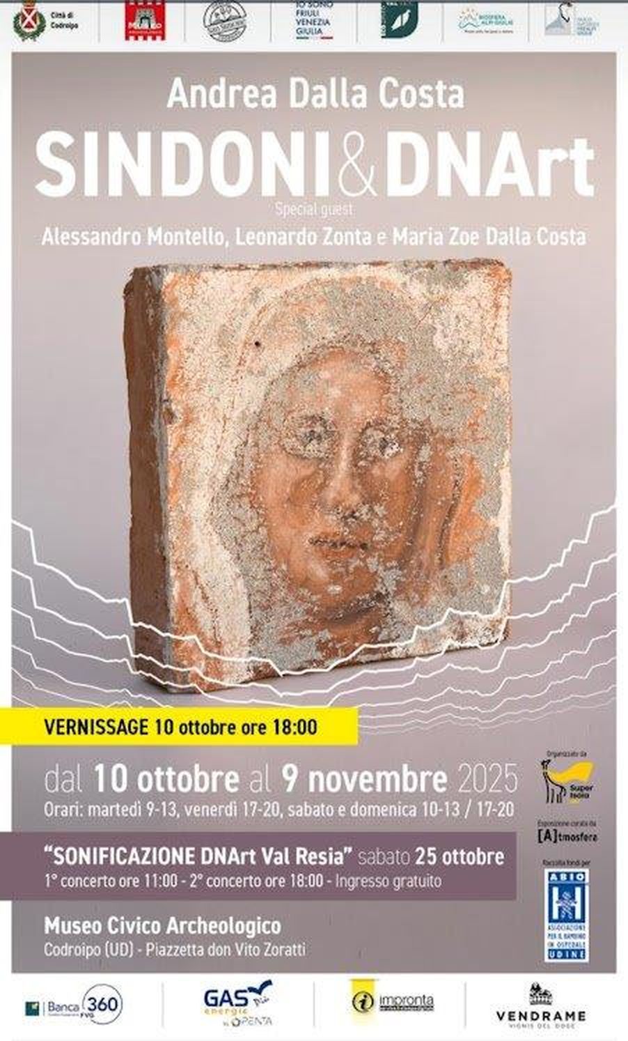 Il Museo Civico Archeologico di Codroipo ospita dal 10 ottobre al 9 novembre la mostra “SINDONI & DNArt” di Andrea Dalla Costa, inaugurata venerdì 10 ottobre alle ore 18:00. L’esposizione riunisce due percorsi di ricerca dell’artista: “Sìndoni”, un ciclo di opere che indaga il rapporto tra corpo, memoria e spiritualità laica attraverso superfici trasparenti e materiali leggeri, evocando la presenza assente del corpo come traccia e memoria; e “DNArt”, progetto che fonde arte, scienza e natura trasformando il DNA degli alberi in musica. Il 25 ottobre la mostra sarà arricchita dal concerto “Sonificazione DNArt Val Resia”, esito sonoro del dialogo tra uomo e mondo vegetale ideato da Dalla Costa con la collaborazione del compositore Alessandro Montello. Un’esperienza immersiva che attraversa il visibile e l’invisibile, la materia e il suono, la memoria e la vita.