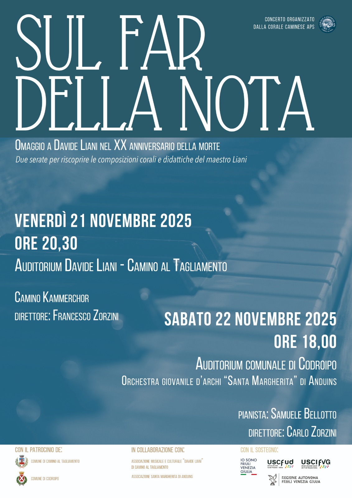 Nel XX anniversario della morte del m.o Davide Liani, la Corale Caminese propone un ciclo di eventi. I primi appuntamenti avranno luogo venerdì 21 novembre a Camino (auditorium D. Liani ore 20,30) e Sabato 22 novembre (auditorium di Codroipo via IV novembre ore 18, 00).