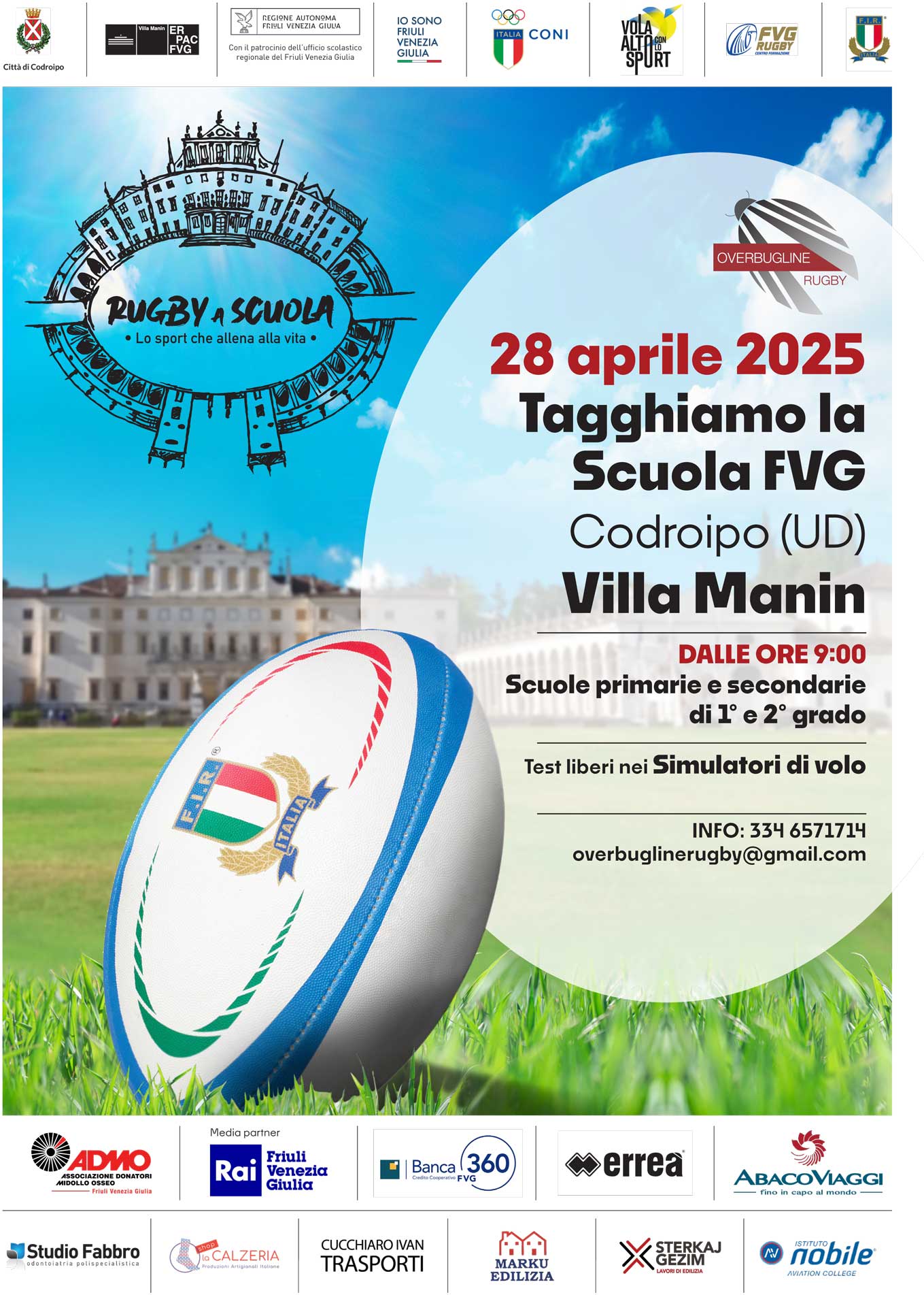 Evento realizzato in collaborazione con la Regione Friuli Venezia Giulia, Turismo FVG, l’Ufficio scolastico del Friuli Venezia Giulia, FVG Rugby, Vola Alto con lo sport, Istituto Nobile Aviation college di Fagagna (UD) e con il patrocinio dei comuni di Udine, Codroipo, Lignano Sabbiadoro, Sedegliano, Spilimbergo, Flaibano, Povoletto. Media partner: Rai Friuli Venezia Giulia.