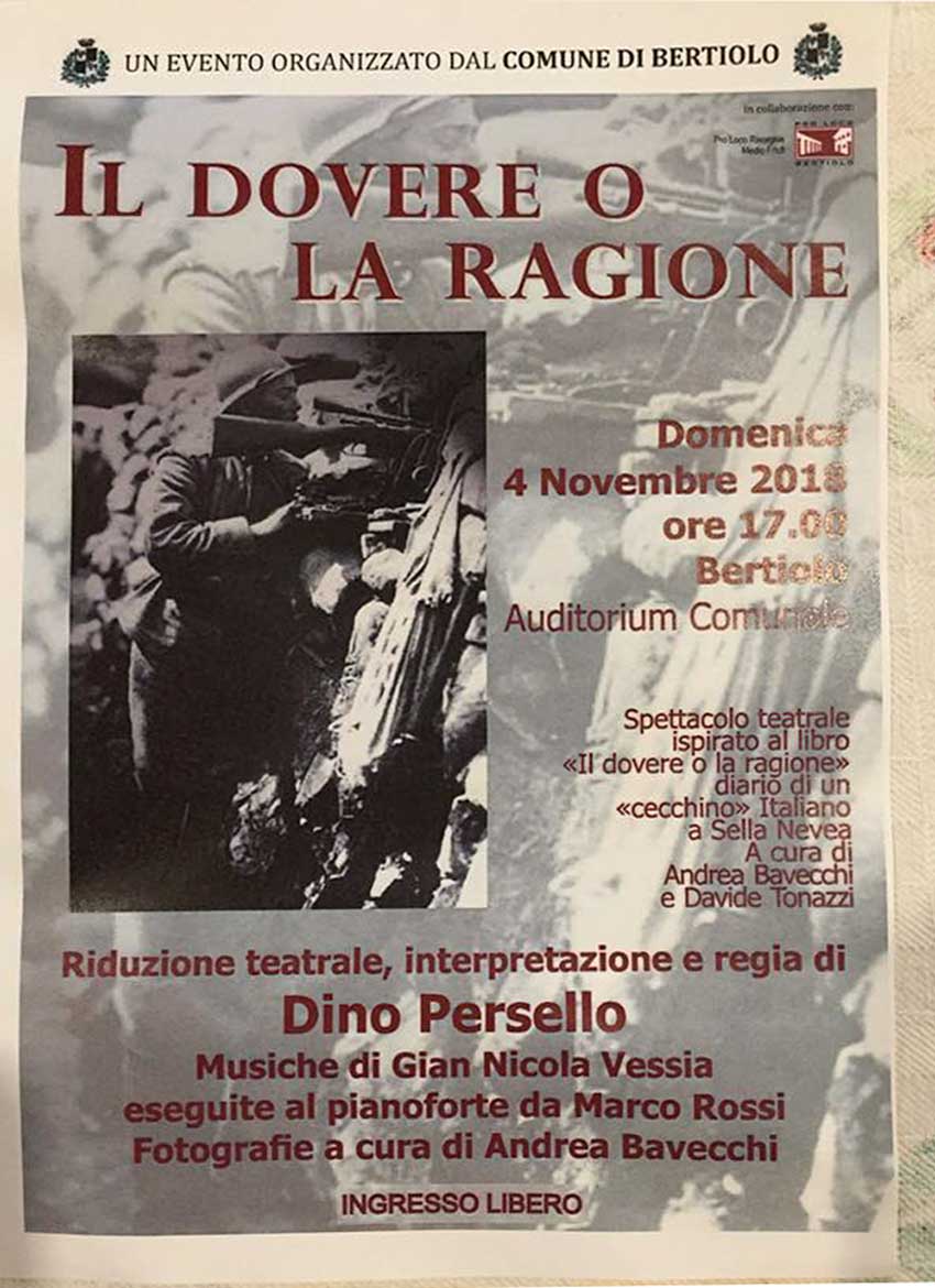 Lo spettacolo, di e con Dino Persello, e con musiche a cura di Marco Rossi, è ispirato al libro “Il dovere o la ragione. Alpi Giulie, Ottobre 1917. Diario di un cecchino italiano a Sella Nevea” pubblicato a cura di Andrea Bavecchi e Davide Tonazzi, nel quale l’anonimo tiratore scelto del Regio Esercito, autore del diario, descrive luoghi, avvenimenti e sensazioni del periodo passato al fronte di Sella Nevea, narrando degli avvenimenti culminati con i tragici eventi di Caporetto ed il suo personale epilogo nel campo di prigionia di Sigmundsherberg.