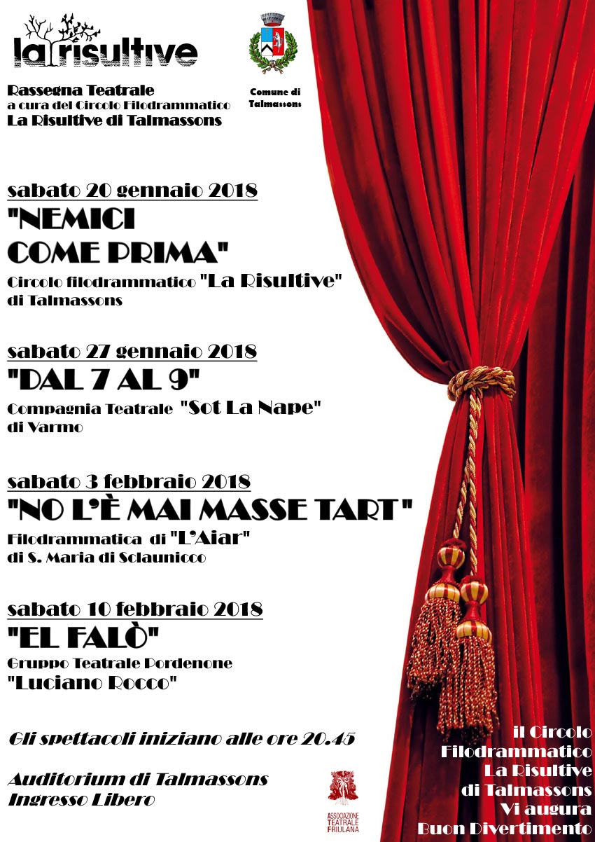 Con il patrocinio e il sostegno dell'Amministrazione comunale, il Circolo Filodrammatico La Risultive di Talmassons organizza quattro appuntamenti con il teatro amatoriale.