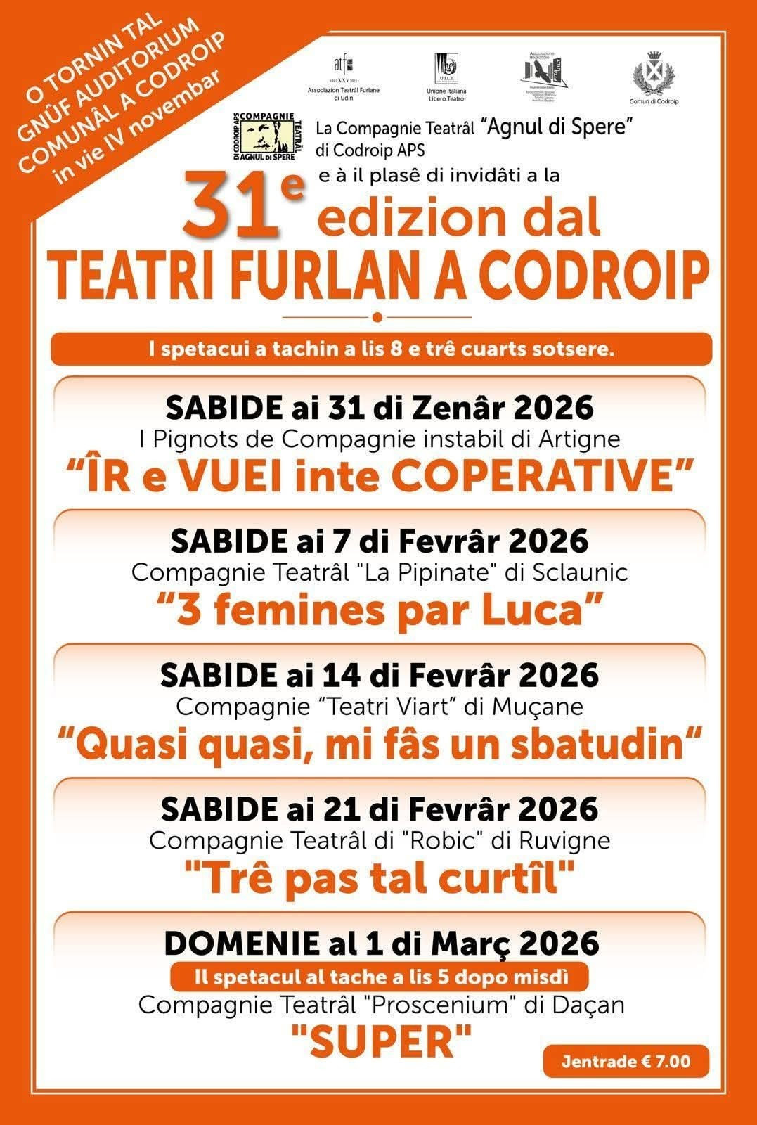 Spettacolo della Compagnie Teâtral "Robic" di Ruvigne nell'ambito della rassegna del Teatri Furlan a Codroipo, organizzata dalla Compagnie teatral " Agnul di Spere" e giunta alla 31^ edizione.