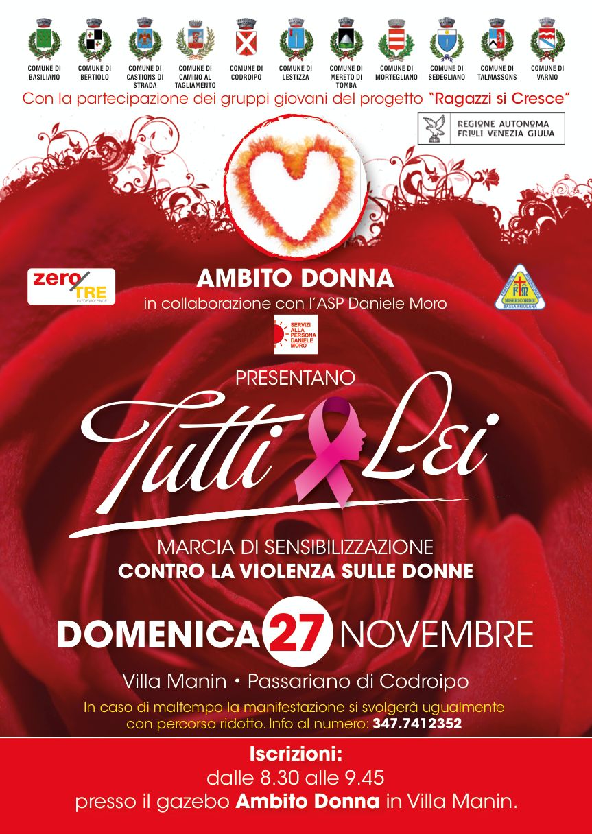 La marcia "Tutti X Lei" è il primo di una serie di 3 eventi di sensibilizzazione contro la violenza di genere organizzati nel territorio dell'Ambito: per giovedì 1 e lunedì 5 dicembre 2016 sono state organizzate due serate informative a Sedegliano e a Varmo sul tema della violenza di genere e dell’autodifesa delle donne.