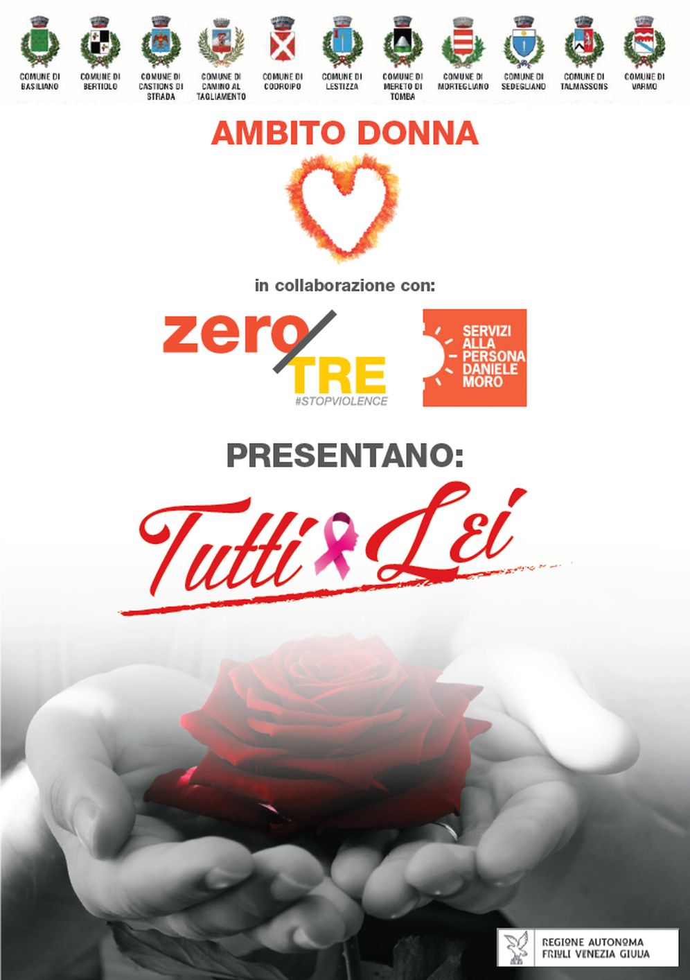 In occasione della giornata mondiale contro la violenza sulle donne, Ambito Donna, il gruppo rappresentante tutti gli 11 comuni dell'Ambito distrettuale di Codroipo (Basiliano, Bertiolo, Camino al Tagliamento, Castions di Strada, Codroipo, Lestizza, Mereto di Tomba, Mortegliano, Sedegliano, Talmassons, Varmo), in collaborazione con l'ASP Daniele Moro, le Associazioni Zero su Tre e La Misericordia, è lieto di invitare alla serata informativa riguardo il tema della violenza di genere e dell'autodifesa delle donne.
